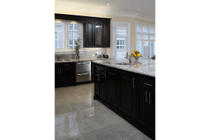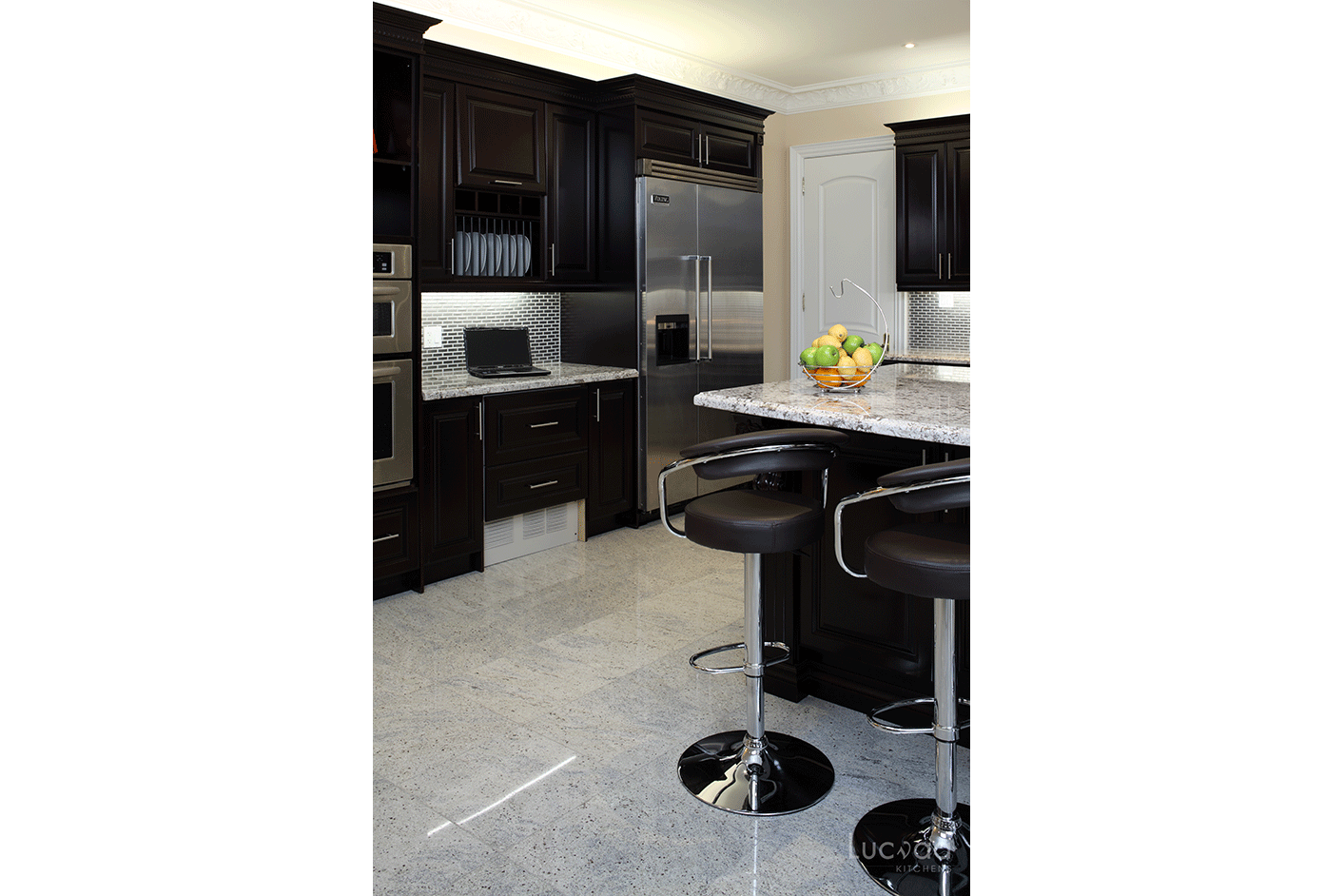 This designer kitchen in an Espresso finish with Toscana doors is not only expansive and luxurious; it also delves into both traditional and modern elements with its decorative corbels and stainless steel appliances.