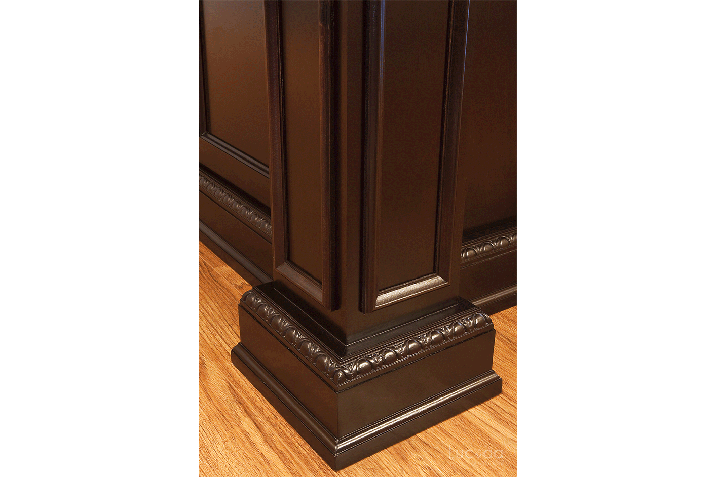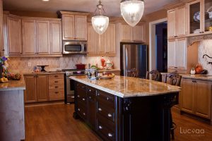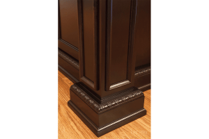 Richly detailed crown moldings, corbels and ornate plinths create a successful marriage between design elements, and highlight the Toscana doors style in a custom weather finish. The over sized island with the Chestnut finish adds artistry to the entire kitchen.