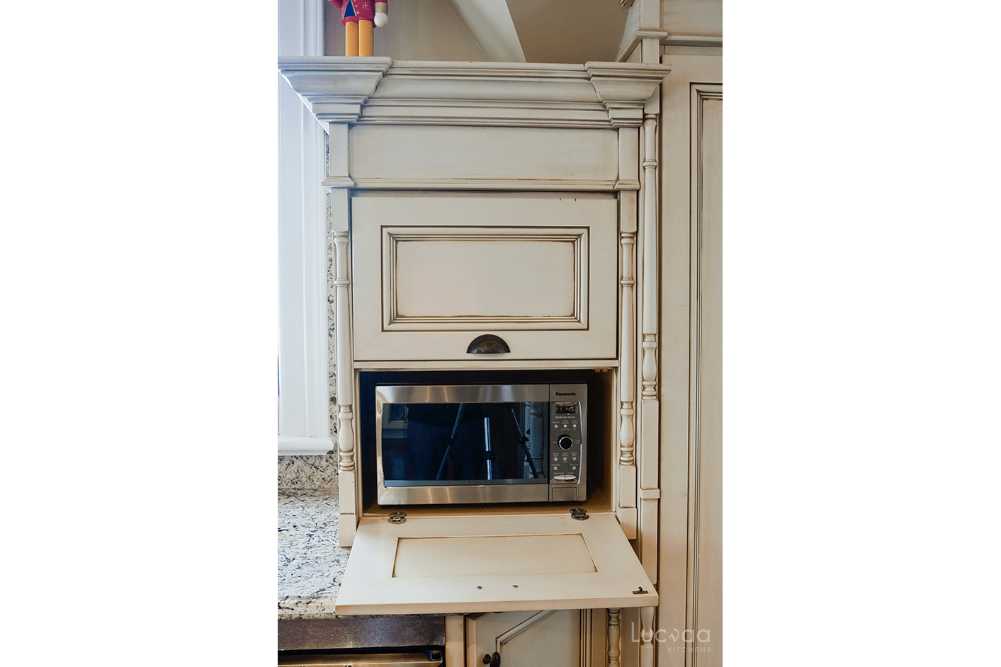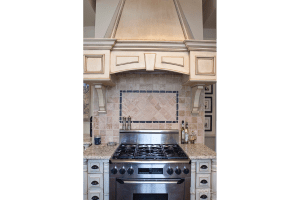 Richly detailed crown moldings, furniture styles legs, and decorative hoods unifies antique design elements. The Castlemore door style in Off-Whie with Glaze is the focal point of this Kitchens.